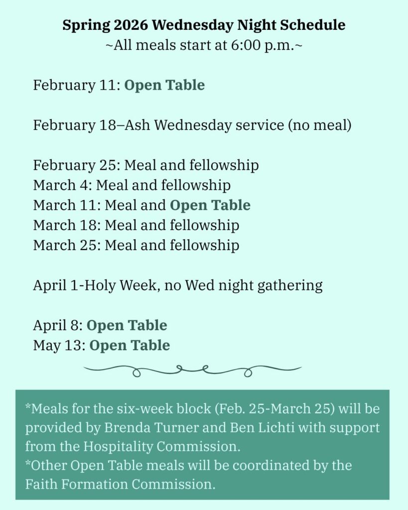 Faith Formation has set our Wednesday night schedule for this semester. Thank you to those who shared their thoughts with us through the survey and through conversations. We recognize that the six-week meal and fellowship schedule is valued by many people and also received very positive feedback about the monthly intergenerational worship–particularly from our families with school-aged children. We are preserving both elements. The “Messy Church” from last year is now called “Open Table,” but the idea is the same: a time to learn, worship, and connect across generations. On Open Table Wednesdays, all ages–including high school youth–are invited to participate. The youth group will have a brief gathering after Open Table in the youth room upstairs. See schedule below. There are also fliers in the literature racks in the front foyer.